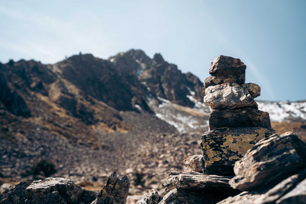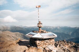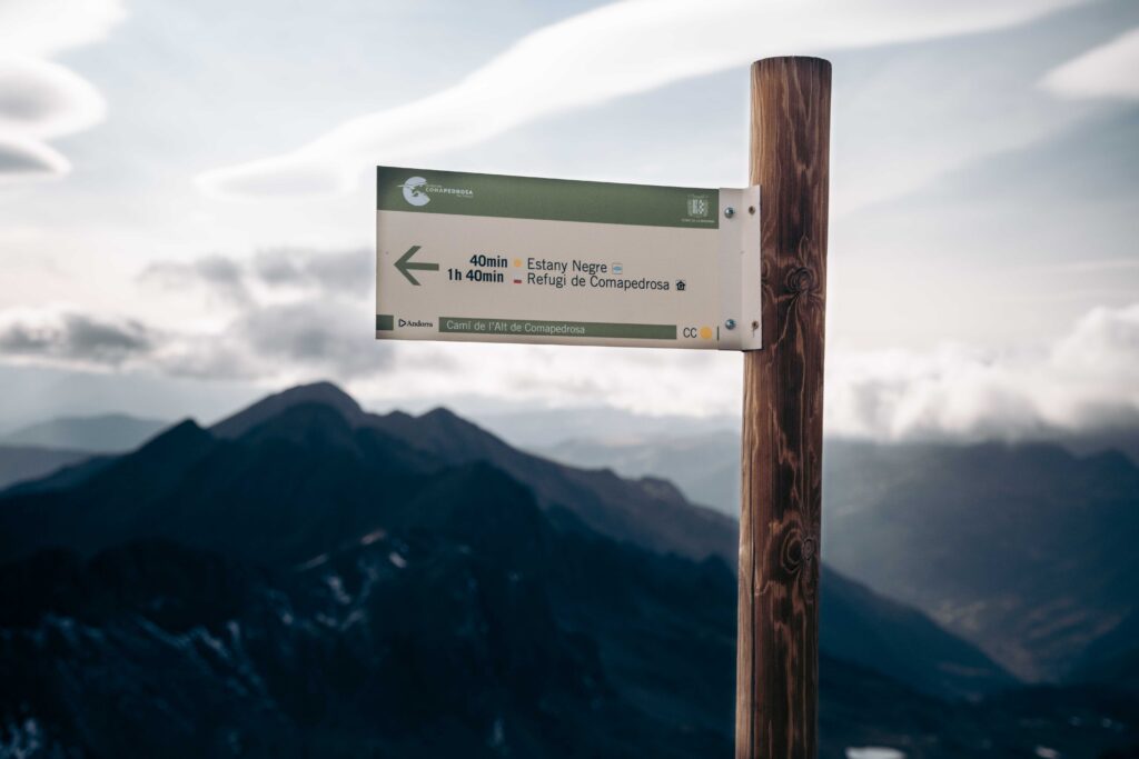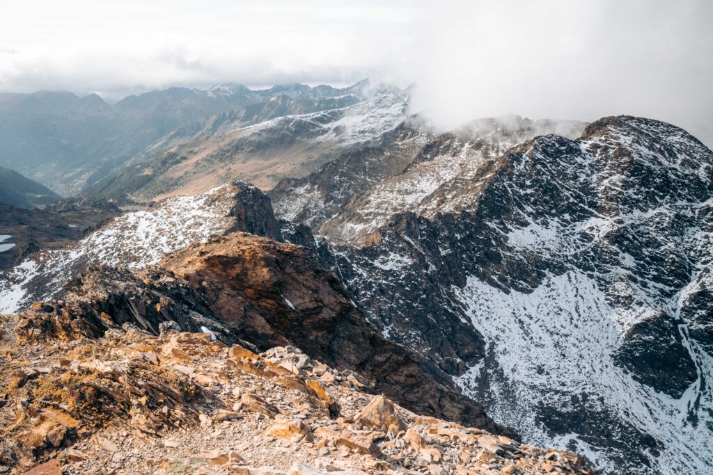 Boven aangekomen, voel ik een enorme voldoening. De panorama’s zijn onwerkelijk, met een uitzicht dat zich uitstrekt over de valleien en toppen van Andorra, Catalonië en Frankrijk. Een stapel stenen markeert het hoogste punt, een stille getuige van de vele wandelaars die me voorgingen. Maar donkere wolken naderen snel en het begint te druppelen. Ik maak vlug wat foto’s en begin haastig aan de afdaling.