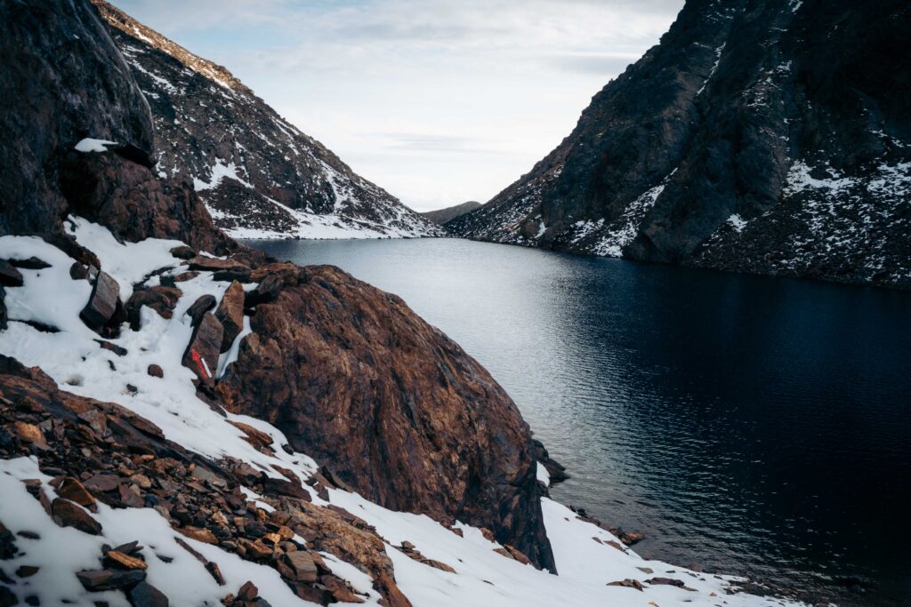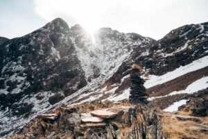 De klim gaat verder en ik nader de sneeuwgrens. De bomen en struiken zijn allang verdwenen, vervangen door een ruiger, rotsig landschap. Het zicht is werkelijk verbluffend, maar de resterende weg naar de top is steil en vol hindernissen. De sneeuw aan het einde van de zomer is verraderlijk dun, en af en toe zak ik erdoorheen, waarbij mijn been vast komt te zitten tussen de onderliggende rotsblokken. Een ronduit gevaarlijke situatie. Mijn hart bonkt in mijn borst, en zelfs mijn viervoeter Pindakaas blijft dicht bij me uit angst. Door mijn late start loop ik bovendien achter op schema. Er is niemand anders te bespeuren en ik ben helemaal alleen, terwijl de zon steeds verder zakt. Een gevoel van twijfel bekruipt me.