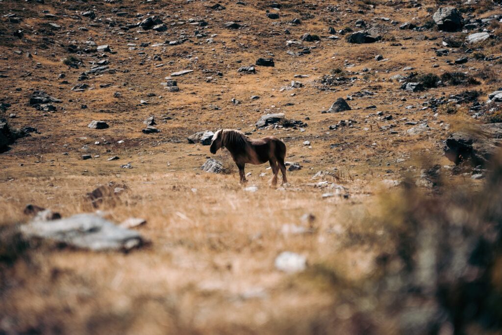 Naarmate ik verder klim, transformeert het landschap. Het dichte bos maakt plaats voor weidse grasvelden en steeds ruiger terrein met meer stenen. Uiteindelijk kom ik op een kleine vlakte met een kristalhelder bergmeer en een verlaten wandelaarsverblijf, de ideale plek om even uit te rusten. Het uitzicht over de bergpas is werkelijk adembenemend. Dit is het hooggebergte op zijn best. Wilde paarden zoeken verfrissing aan het water, en ik besef nog niet dat het zwaarste deel van de tocht nog moet komen.
