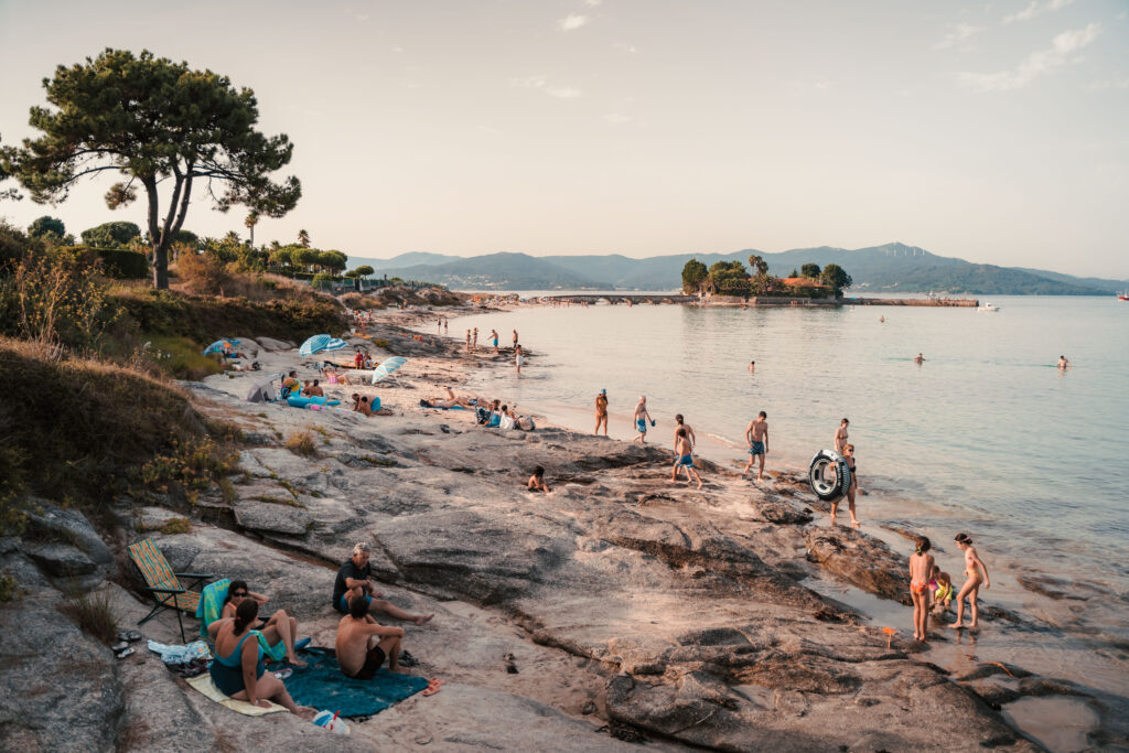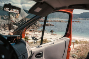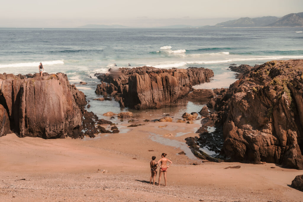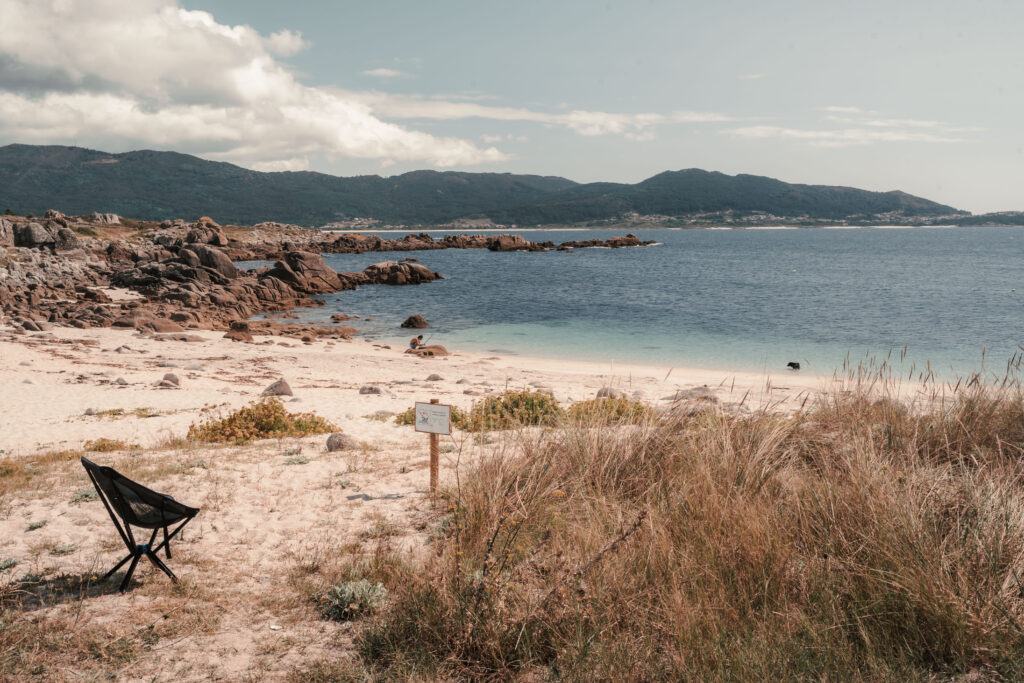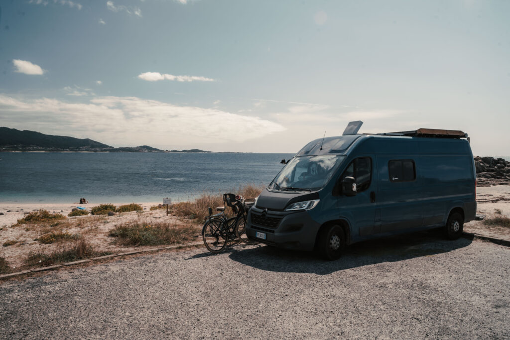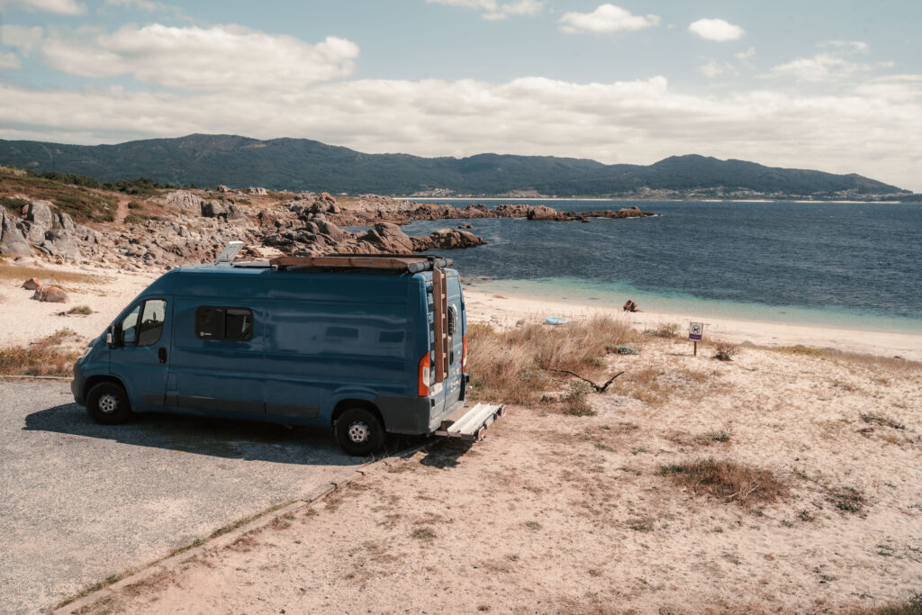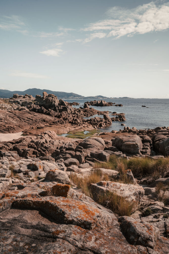 Bij aankomst zie ik enkele andere camperbusjes staan, genesteld tussen de naaldbomen die schaduw en gezelligheid bieden dankzij gemeenschappelijke picknicktafels. Het strand is een toonbeeld van de Galicische kust: breed, open, en een beetje wild, een canvas waarop de natuur haar eigen verhaal schildert. Dat wordt ook geïllustreerd door de messcherpe rotsen, geërodeerd door eeuwenlange golfslag, die het ene van het andere strand scheiden.