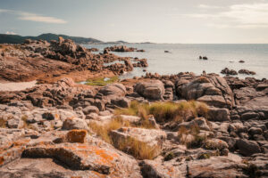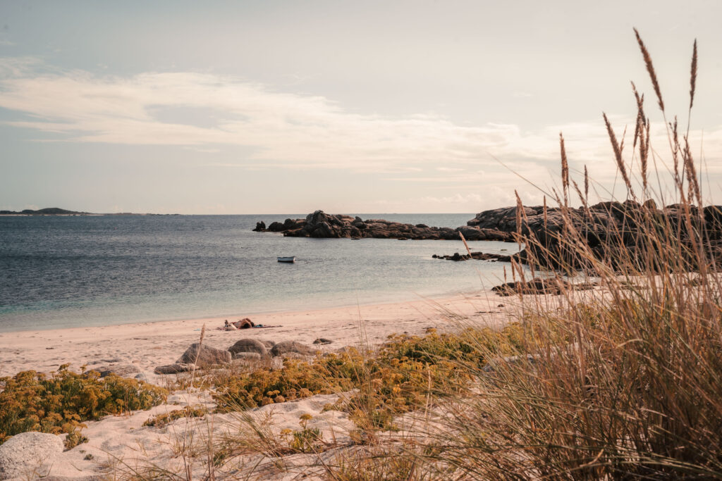 Mijn kampeerplek voor de nacht is aan de noordzijde van de baai van Carnota, bij Praia da Insuela. Deze afgelegen locatie biedt een fantastisch panoramisch uitzicht over de wijde baai. Het is werkelijk de ideale plek om te kamperen: verborgen en kalm, maar ook wondermooi. De helderheid van het water, de rustige omgeving en de afgelegen baaitjes in de buurt zorgen voor een paradijselijk gevoel. Die avond ervaar ik, in het bijzijn van medekampeerders, een magisch spektakel van vallende sterren, terwijl de aarde door de Perseïden-meteorenzwerm trekt. Dit voelt magisch.