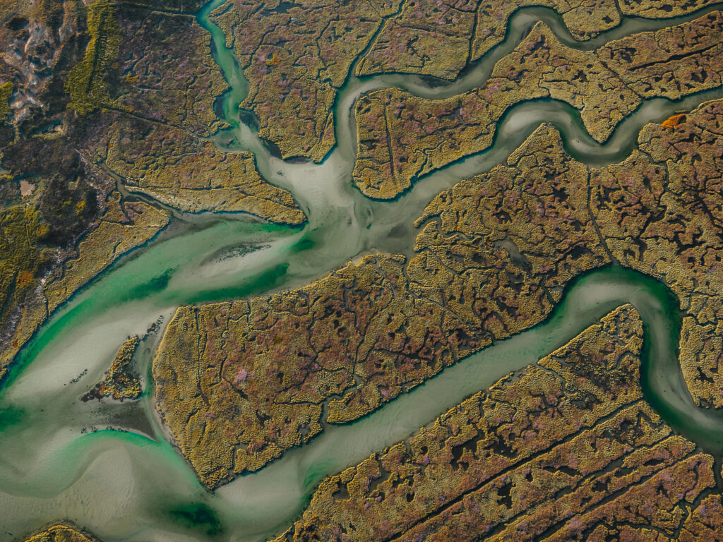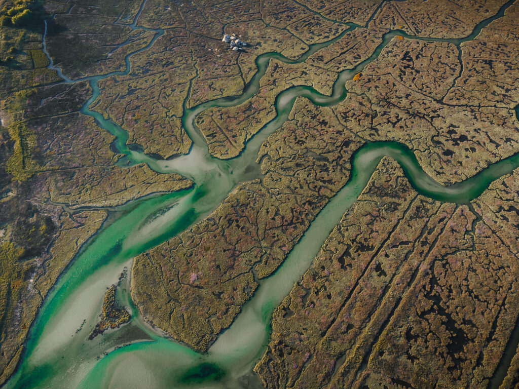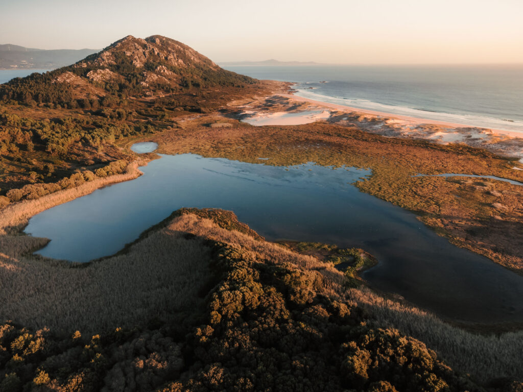 Zijn meest opvallende troef is de enorme Duna de Corrubedo, een zandduin die kan variëren in vorm en positie, afhankelijk van de wind. Dit dynamische karakter geeft een voortdurende verandering aan het landschap. Vanuit de lucht lijkt het nationaal park een surrealistisch spektakel van kleine riviertjes die kronkelend uitmonden in een prachtige lagune die op zijn beurt zijn weg vindt naar de oceaan. Ik leg mijn drone opzij, trek mijn zwemshort aan en plons in het warme water van de lagune. Ahh, wat voelt het heerlijk om in Galicië te zijn.
