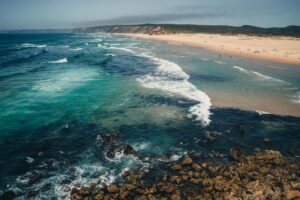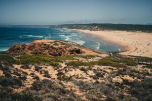 De volgende vier dagen rijden we noordwaarts richting Setúbal. Het traject bestaat uit tal van grindpaden en er staat veel wind. We blijven in de buurt van de kust, maar we rijden er niet vlak langs af. Af en toe worden onze ogen echter wel verwend met zicht op de ruwe Atlantische oceaan en diens golven die inslaan op enorme kliffen, zoals bij Praia da Bordeira vlak bij Carrapateira, een slaperig dorpje vooral geliefd bij surfers, zo’n twintigtal kilometer boven Sagres. De beukende golven zijn ontzagwekkend in dit gedeelte van Portugal, en dat zal de hele tocht noordwaarts niet veranderen. We zoeken een camping in de buurt van Aljezur, waar een relaxte, kalme sfeer heerst.